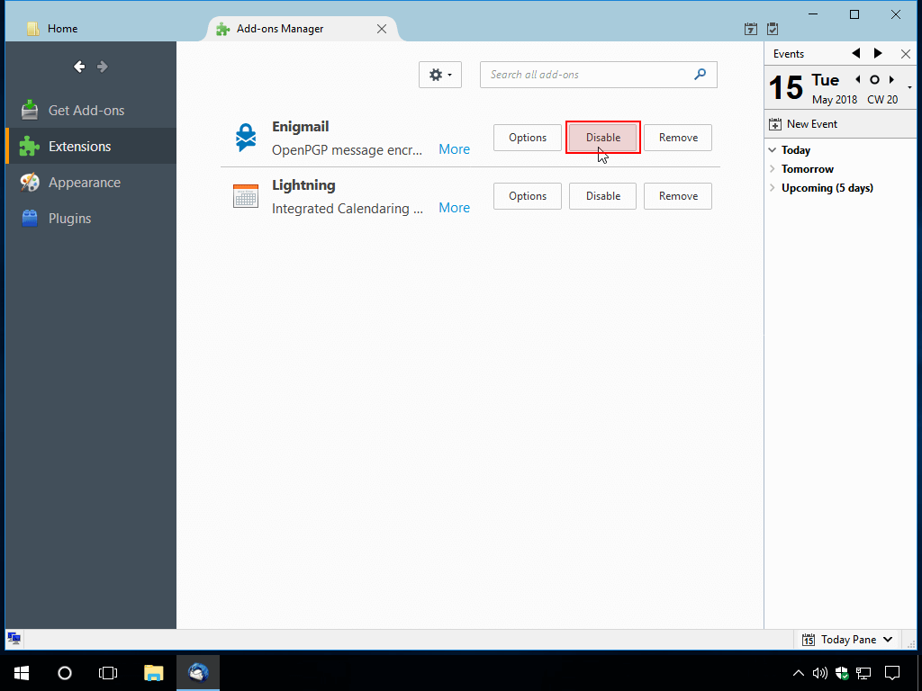 ۳) سپس در صفحه Add-ons Manager روی گزینه Disable در مقابل Enigmail کلیک کنید.